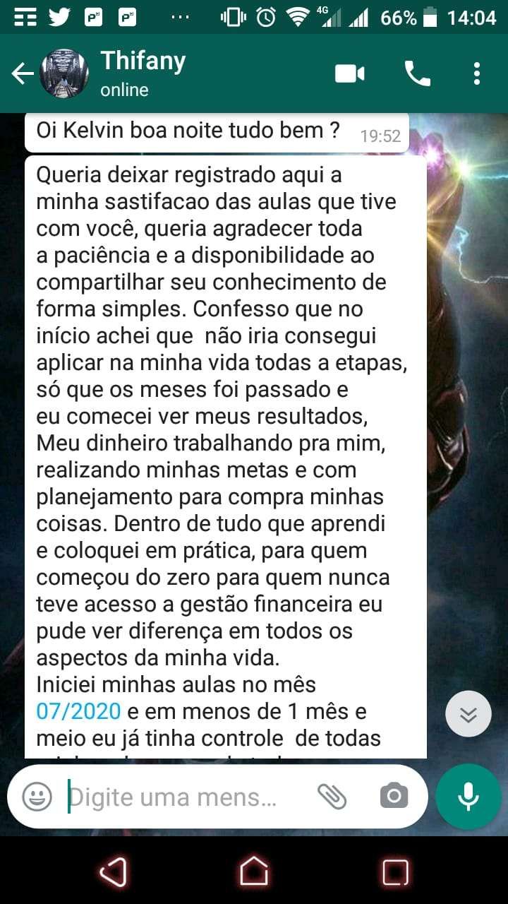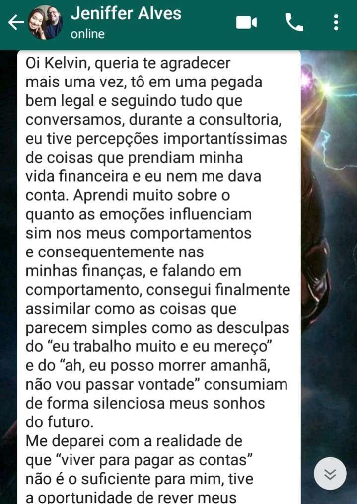 Kelvin é um entusiasta na área de humanas, especificamente da parte que estuda o comportamento humano. Sempre teve facilidade com números e descobriu por acaso sua habilidade de ensinar e passar o conhecimento, quando se viu obrigado a empreender realizando consultorias financeiras. Ao longo de sua experiencia acabou encontrando padrões comportamentais que definiam o sucesso financeiro de seus clientes, e decidiu então desenvolver um projeto ousado, “Ajudar as pessoas identificar e modicar hábitos destrutivos, para que possam ter uma vida financeira estabilizada”